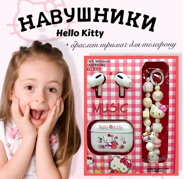 Навушники бездротові дитячі вакумні з кейсом та тримачем hello kitty Хеллоу Кітті Sanrio білий (AN)34183