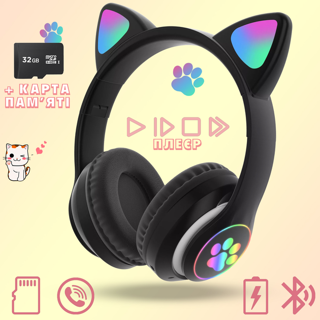 Навушники котик bluetooth підсвічування карта пам'яті AUX-кабель мікрофон акум. 400 mAh чорні З 64092