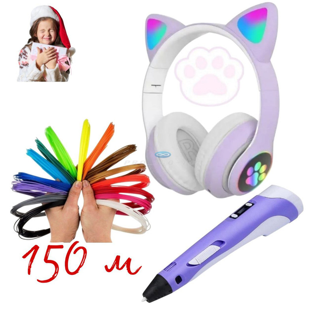 Комплект Дитячі Навушники з Котячими Вушками STN-28 Purple, 3D-ручка для малювання, 150 метрів різнокольорового пластику