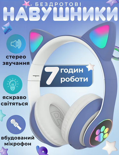 Блютуз навушники з вушками бездротові bluetooth сині дитячі навушники з підсвічуванням