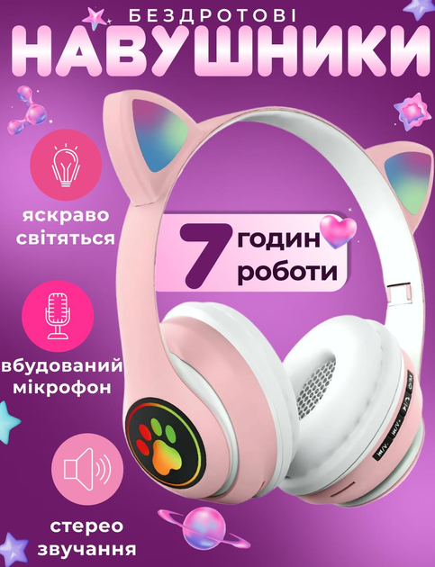Блютуз навушники з вушками бездротові bluetooth рожеві дитячі навушники з підсвічуванням