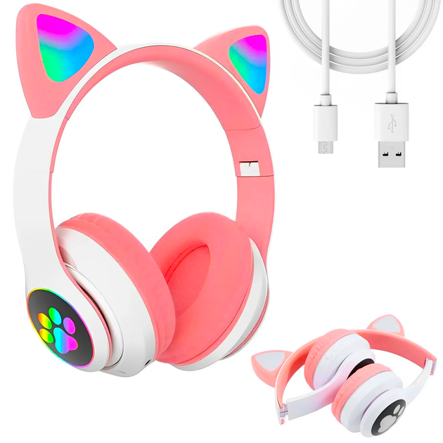 Навушники бездротові з котячими вушками та лапками, Рожеві / Дитячі з мікрофоном та кольоровим підсвічуванням / Bluetooth ZA