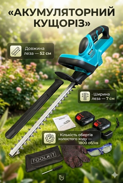 Кущоріз акумуляторний 48V, безщітковий, довжина леза 52 см для саду та ділянки