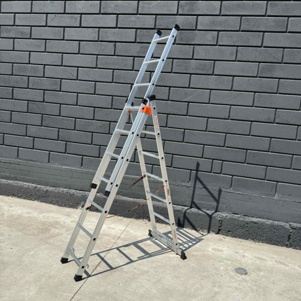 Робоча висота, м: 6.83; Антиковзаючі вставки на сходинках: Ні; Бренд: Техпром; Кількість секцій, шт: 3; Кількість сходинок: 9 шт; Країна-виробник: Україна; Максимальне навантаження, кг: 150; Матеріал: Алюміній; Нековзні опорні наконечники: Ні; Сфера застосування: Побутове використання; Ширина сходинок, см: 44; Тип: Універсальна; Вага, кг: 13.6