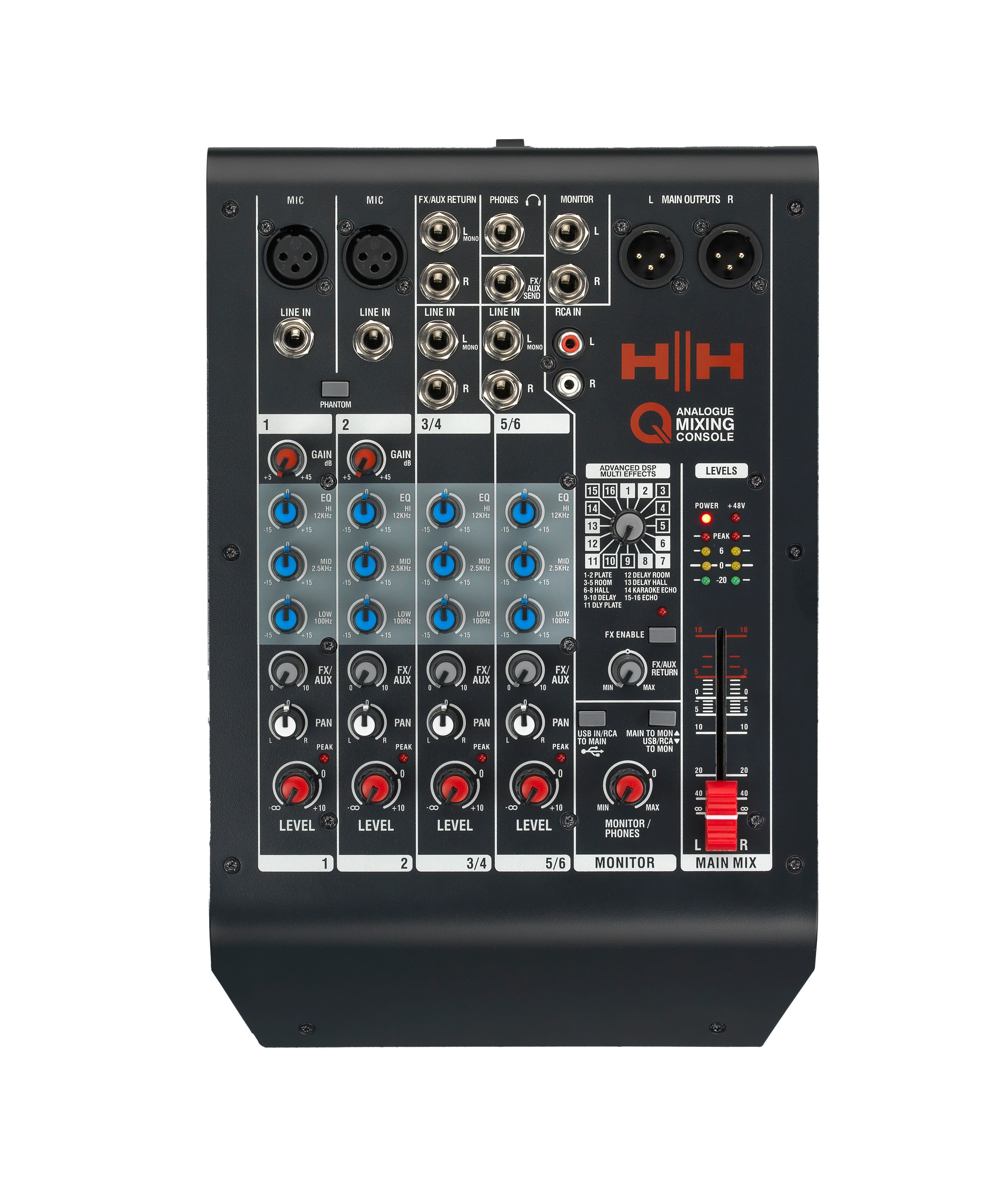 Q6FX — компактный 6-канальный аналоговый микшерный пульт, разработанный и изготовленный в Великобритании. Q6FX состоит из 2 монофонических входных каналов с микрофонными входами, в которых используются малошумящие микрофонные предусилители, а также опция линейного входа на каждом канале. Входные моноканалы расположены рядом с двумя линейными входными стереоканалами, которые