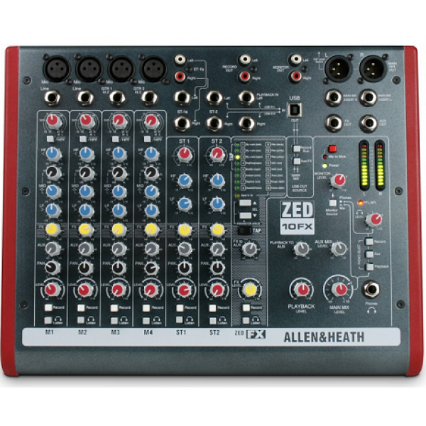 Мікшерний пульт Allen&Heath ZEDi-10FX ALLEN & HEATH ZEDI-10FX - компактний мікшерний пульт, новий дизайн преампов GSPre, 4 мікр/лін/ Hi-Z (2) входу (48 V фантом), 2 стерео входи, 3-х смуговий EQ на моно входах, окрема шина PFL , XLR Main виходи, 60мм майстер фейдер, 1 AUX і 1 FX OUT, вбудований блок живлення, вбудований USB інтерфейс 4 входи х 4 виходи (24 біт/96кГц), вбудований процесор FX (100 ефектів), Tap tempo. Основні особливості ALLEN & HEATH ZEDI-10FX: - мікрофонні передпідсилювачі G