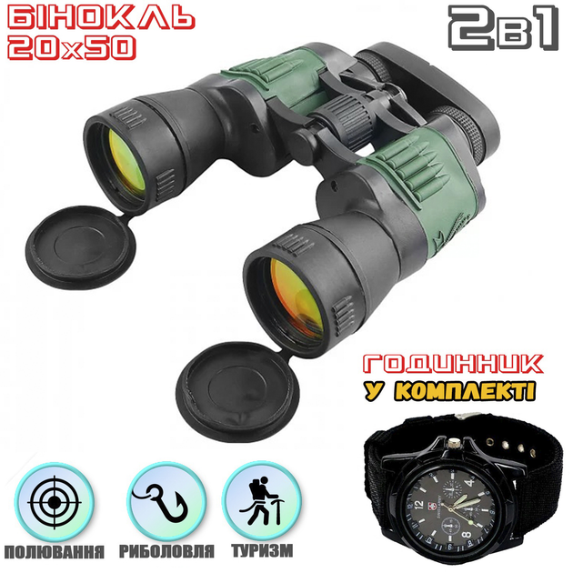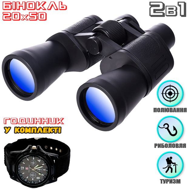 Бінокль повнорозмірний Galileo 20Х50 Porro водонепроникний для спостереження + Годинники кварцові SwissArmy