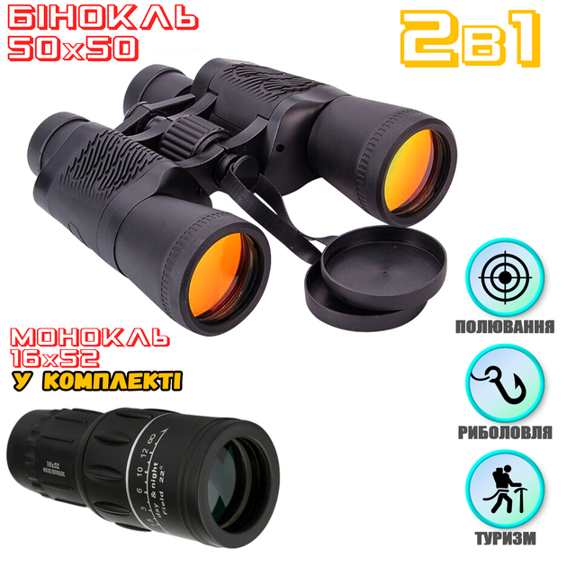 Бінокль S-Optics 50x50 повнорозмірний, водонепроникний 119m/1000m Porro BAK7, з чохлом + Монокуляр Galileo 16х52 гумовий