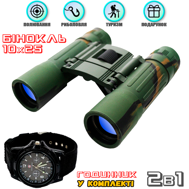 Бінокль Galileo 10x25 компактний, складаний, наближення 10х, з чохлом для перенесення Camouflage + Годинники кварцові SwissA