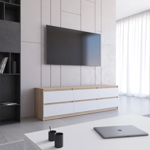Тумба ТВ на 6 висувних шухляд, тумбочка під телевізор з фасадами без ручок R-12 Дуб Сонома \ Білий фасад
