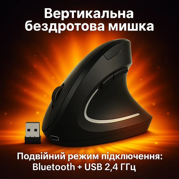 Вертикальна бездротова мишка DualMode-7043 з Bluetooth і USB-приймачем, акумуляторна, тиха, ергономічна