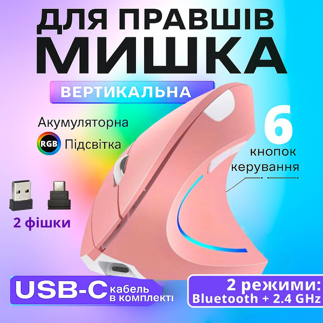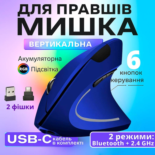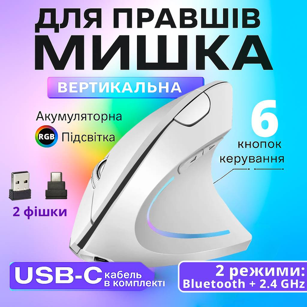 Вертикальна миша для правшів Lem Berger, бездротова, дворежимна, з'єднання по Bluetooth та через фішку 2,4GHz, акумуляторна,