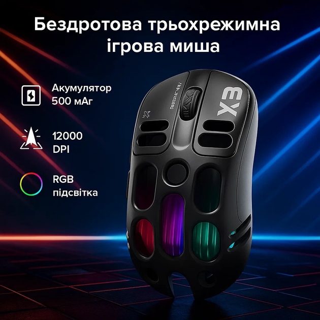 Бездротова ігрова миша трьохрежимна, з RGB підсвічуванням, 500 мАг, DPI до 12000, чорна