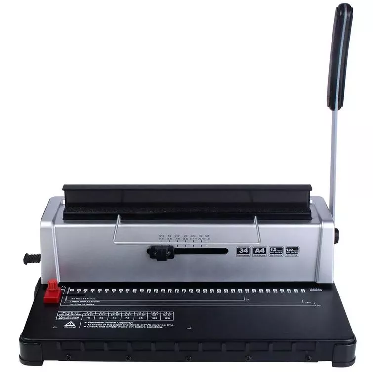 Биндер на металлическую пружину WireBind W-12 (3:1). Мощность перфорации до 12 листов бумаги плотностью 80 г/м2. Тип перфорации – механическая. Рабочая ширина – 300 мм (34 отверстия), шаг перфорации 3:1, квадратные отверстия. Нет ограничения по формату для перфорации и зажима пружины, что позволит переплести форматы любой длины в несколько приемов (в том числе А3 по широкой стороне). Толщина брошюровки до 140 листов. Регулировка глубины перфорации – от 2,5 до 4,5 мм. Встроенный магнит в устройстве обжима пружины помогает удерживать документ во время брошюровки. Усиленная конструкция. Вес 7 кг. Габаритные размеры 405x235x372 мм.