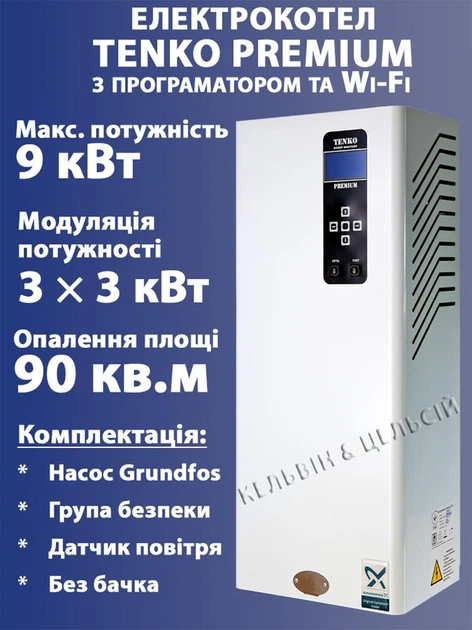 Електрокотел Tenko Преміум 9 кВт 230 В з програматором, Wi-Fi (опція)