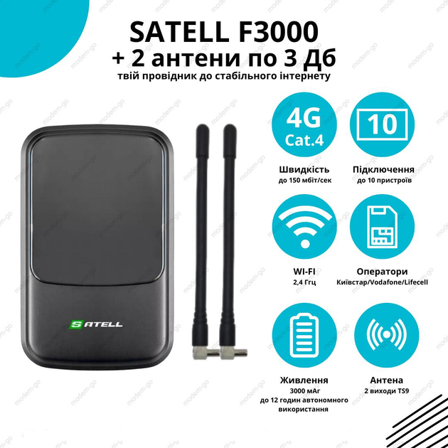 4G LTE Wi-Fi роутер SATEL F3000 LTE | Швидкість до 150 Мбіт/с (Cat.4) | Два виходи під антену | Акумулятор 3000 мАг | Підтри