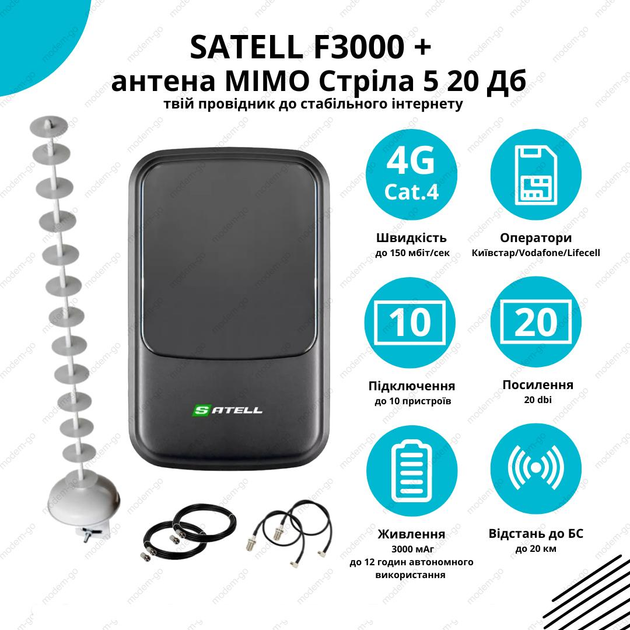 4G комплект WIFI роутер Satell F3000 + антена Стріла MIMO 5 2х20Дб