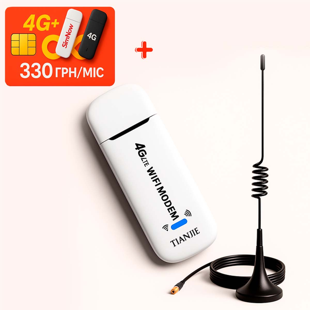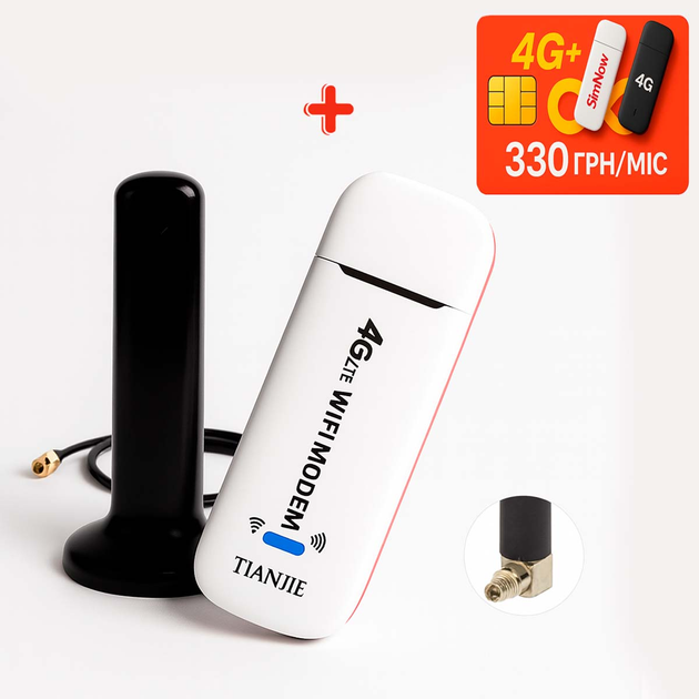 Високошвидкісний 3G/4G LTE USB Wi-Fi модем-роутер TianJie 3 в 1 і автомобільною антеною 7 dBi + Подарунок — безлімітна SIM-к