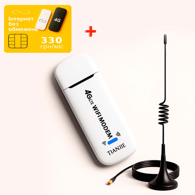 Високошвидкісний 3G/4G LTE USB Wi-Fi модем-роутер TianJie 3 в 1 і автомобільною антеною 7 dBi + 1 місяць безлімітного інтерн