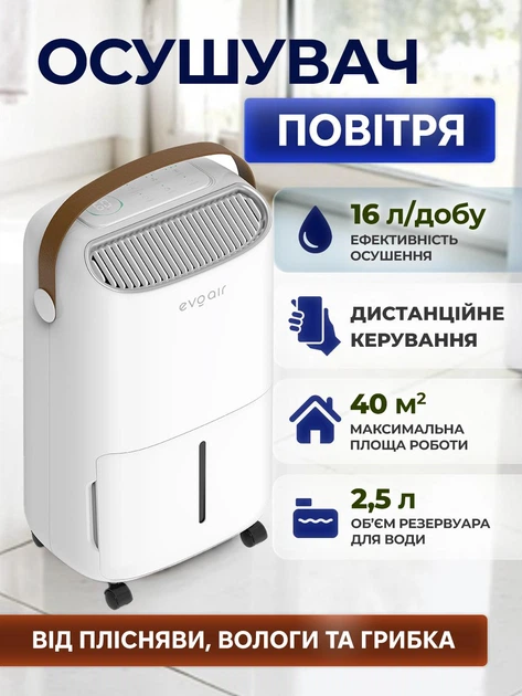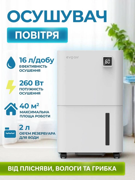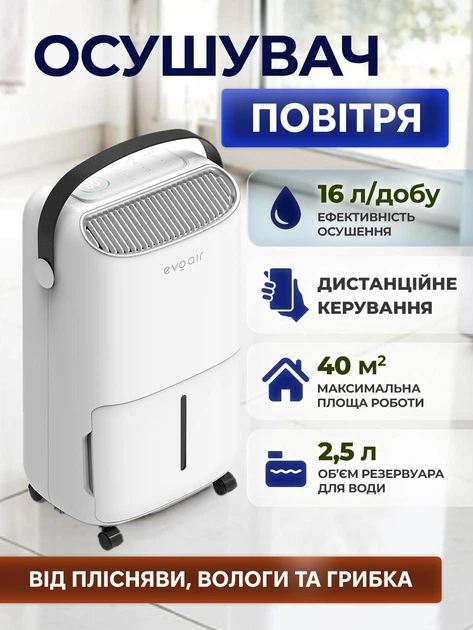 Осушувач повітря EvoAir OptiDry 16 16л/24год датчик вологості функція пам'яті сушіння одягу резервуар 2л цифровий дисплей бі