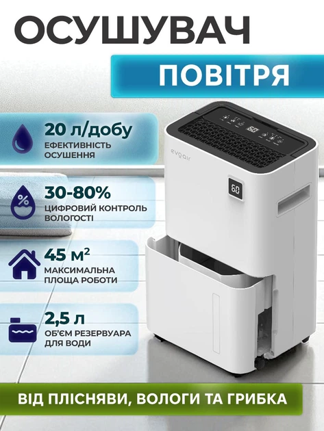 Осушувач повітря EvoAir OptiDry 20 20л/24год датчик вологості функція пам'яті сушіння одягу резервуар 2л цифровий дисплей бі