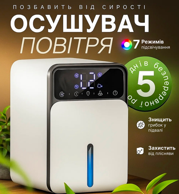 Осушувач повітря кімнатний, сенсорний екран, тихий, бак 1.5л, RGBпідсвітка, для дому, ванної, підвалу