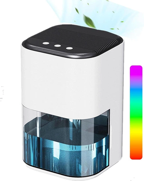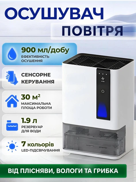Компактний осушувач повітря 30 м для ванни і дому 900 мл/ 24 год evoair HIDRY Plus, резервуар 1.9 л, 7-кольорове підсвічуван