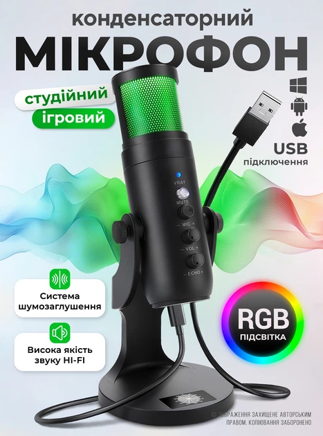 Мікрофон для комп'ютера студійний ігровий для стріма запису музики стриму конденсаторний з підсвічуванням технологія Plug&Pl