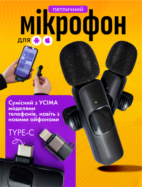 Мікрофон бездротовий петличний для iphone та android з usb type-c та lightning подвійна петличка для блогера запису відео бл