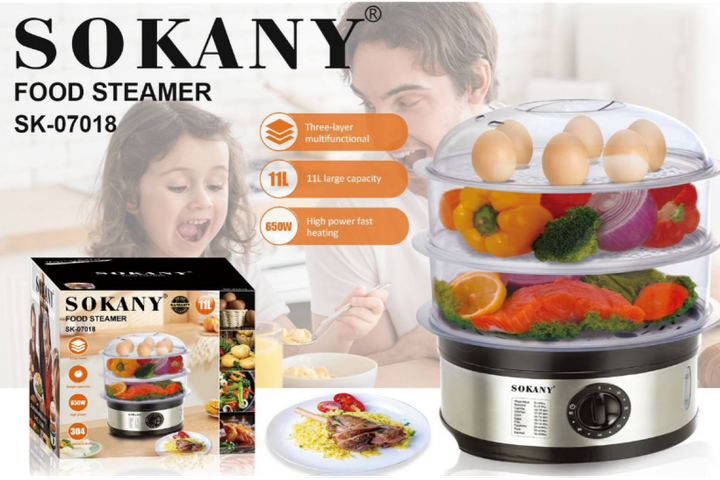 Пароварка Sokany SK-07018 трирівнева, електрична 11 літрів, 650 Вт, сталь (SK-07018)