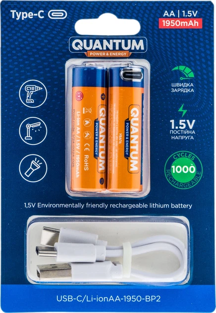 Акумулятор літій-іонний пальчиковий AA 1950mAh із захистом та вбудований зарядний пристрій через USB кабель TYPE-C вхід Quan