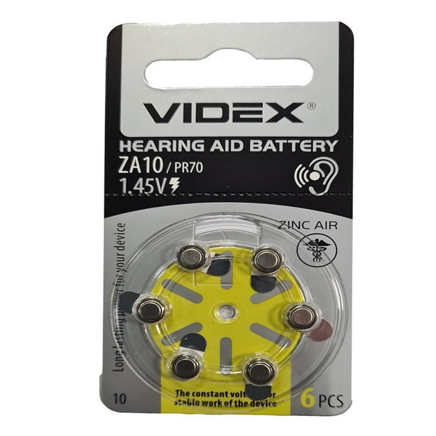 Батарейка Videx ZA10 (PR70) 1,45V (блістер по 6 шт.) для слухових апаратів (57582)