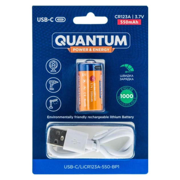 Акумулятор літій-іонний CR123A 550mAh із захистом та вбудований зарядний пристрій через USB кабель TYPE-C вхід Quantum USB L