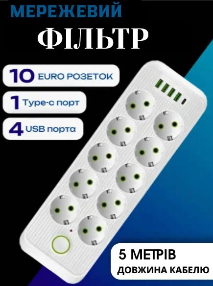 Подовжувач електричний Тк-12 (8220В+4USB+1Type-C) Чорний 5 м