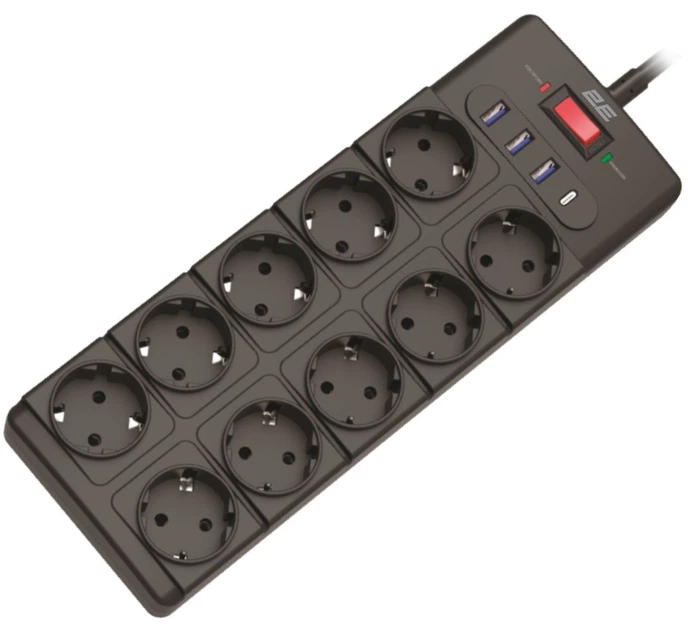 Подовжувач мережевий 2E 3м, 10xТипF, 16A, 3xUSB-A, 1xUSB-C, фільтр, чорний