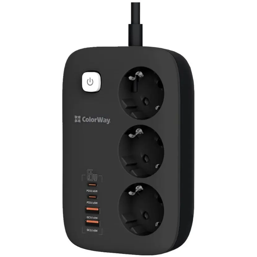 Мережевий фільтр-подовжувач ColorWay CHE34-PD GaN3 Pro PD 65W (2xUSB-A + 2xTYPE-C) 3 розетки 4 USB 2 м Black