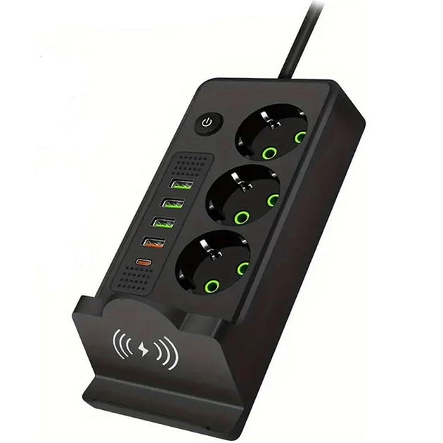 Мережевий фільтр подовжувач з USB Type-C переноска розетка на 3 розетки 3 м бездротова зарядка Чорний