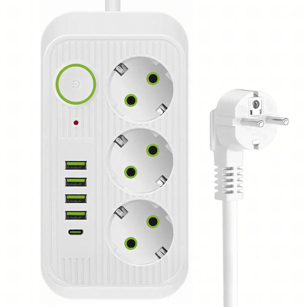 Мережевий фільтр подовжувач з вимикачем та заземленням Power Socket J02 на 4 розетки + 3 USB 3.4A та 1 Type-C Білий