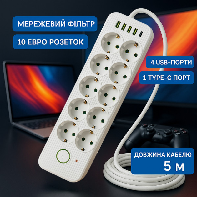 Мережевий фільтр подовжувач 5 м 10 розеток з 4 USB-портами та 1 портом Type-C Білий
