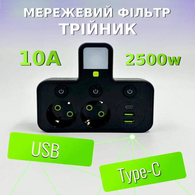 Мережевий фільтр-трійник із підсвіткою без дроту, 2 розетки, 2 USB, 1 Type-C роздільні вимикачі 2500 Вт HG-DUE