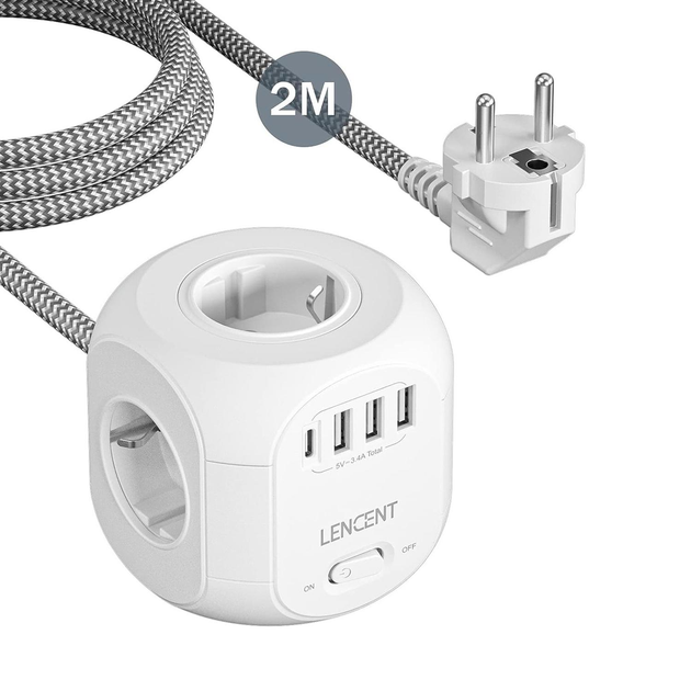 Мережевий фільтр розгалужувач трійник 3EU розетки з вимикачем + USB-C + 3USB-A Lencent PowerCube 4000W/16A Білий