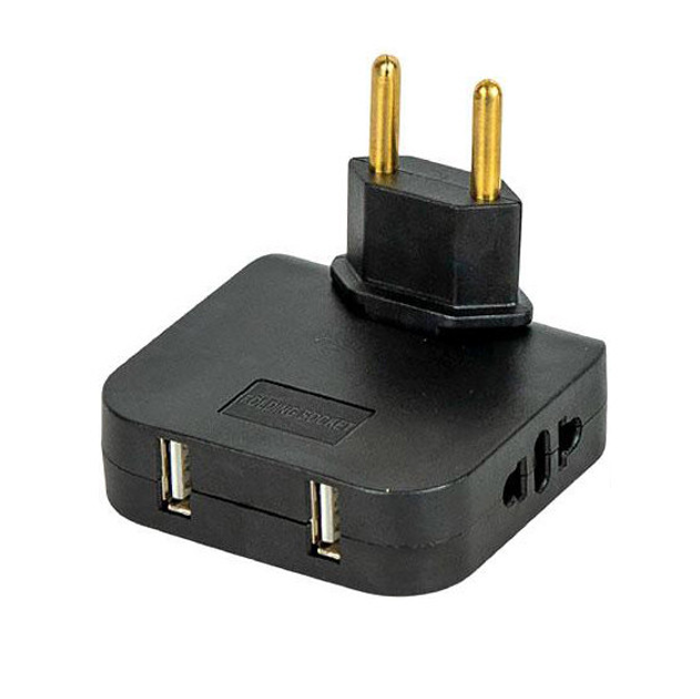 Трійник перехідник у розетку на 2 USB + 2 розетки (Євро) поворотний на 180 градусів плоский чорний