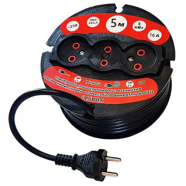 Подовжувач на котушці без заземлення ПВС 2х2,5; 5м; 3 розетки; 16А; 4 кВт.