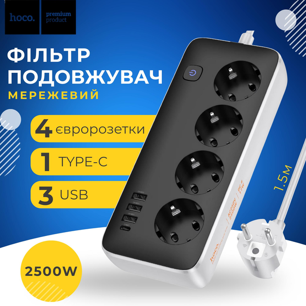 Мережевий фільтр-подовжувач Hoco Premium 2500W 1.5м з багаторівневим захистом 4 розетки 220В 3xUSB 1xType-C з вимикачем для