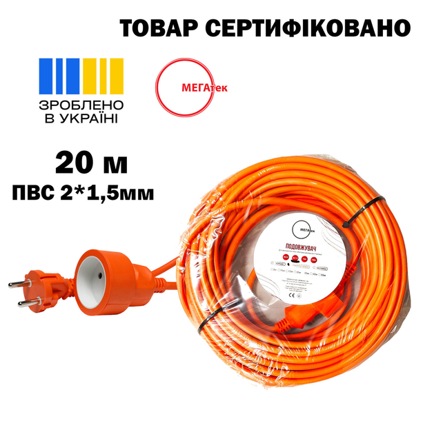 Подовжувач одномісний МЕГАтек помаранчевий 20м ПВС 2*1,5мм МТП-0110-1048