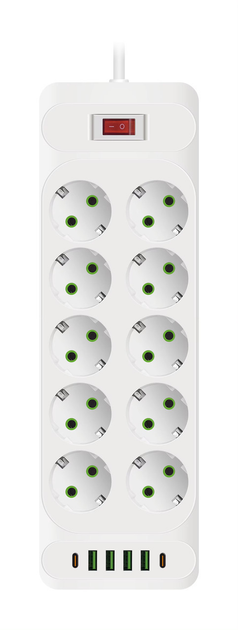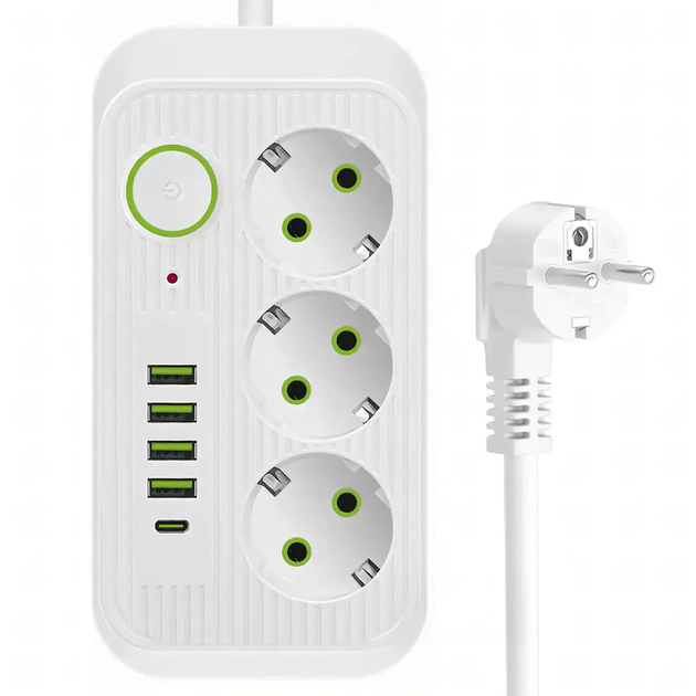 Фільтр мережі F09U на 3 розетки + 4 USB + Type C 2500Вт кабель на 2м White