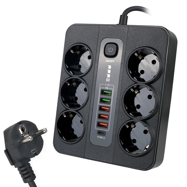 Фільтр мережі F09U на 3 розетки + 4 USB + Type C 2500Вт кабель на 2м Black (SF-1517)