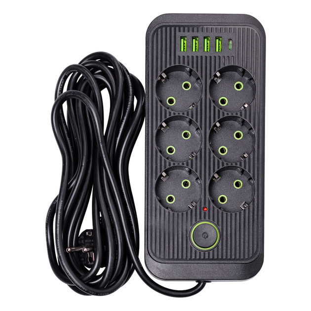 Мережевий фільтр 5 м подовжувач F06U на 6 розеток 4 USB 1 Type-C та кнопкою відключення Чорний HP-5-26