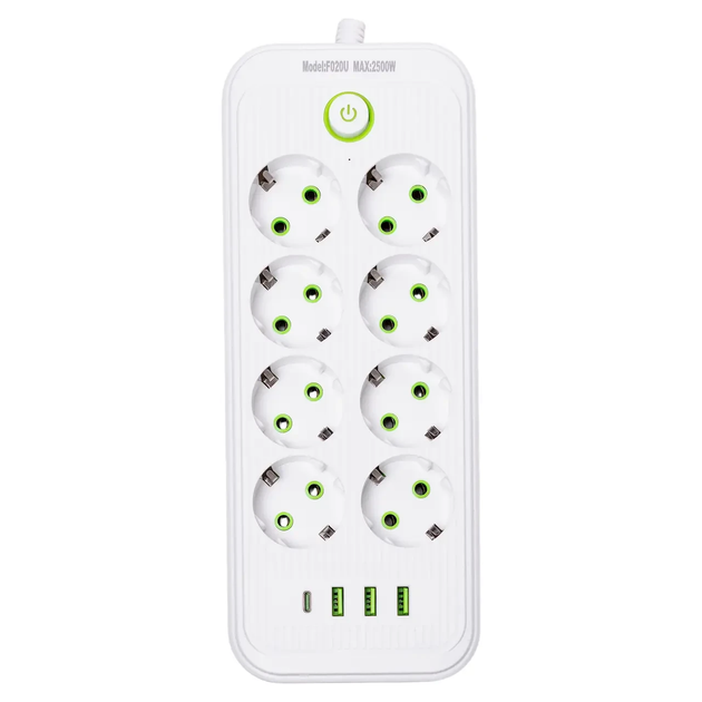 Мережевий фільтр 3 м подовжувач F06U на 6 розеток 4 USB 1 Type-C та кнопкою відключення Білий HP-5-23