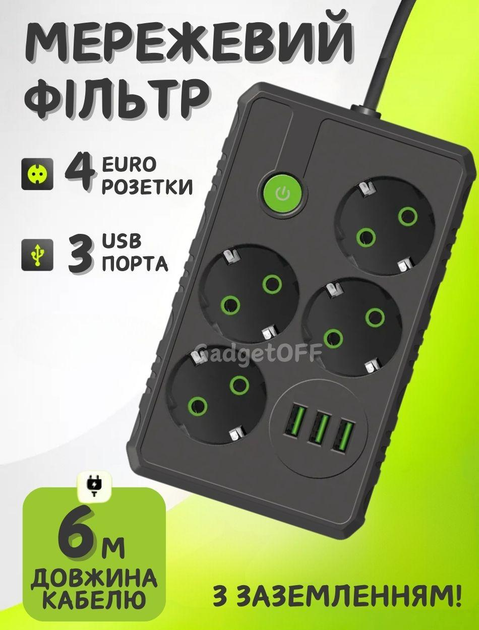 Подовжувач мережевий переноска 6м на 4 розетки + 3USB UA Power F04U Чорний